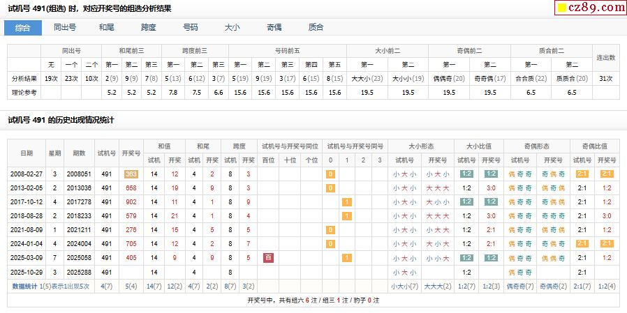 288期福彩3D试机号491对应开奖号的组选分析结果